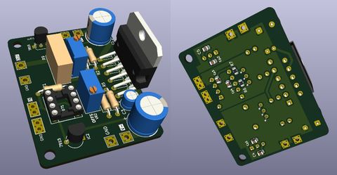 今までプリント基板というものを自分で作ろうとは思わなかったのですが、六十の手習いで、KiCadというものを弄ってみました。試しにヒロさんの回路まんまで、パラ化のための出力抵抗が搭載できるようにし、かつご覧のように上下逆さまにしても見た目シンメトリーになるようにしてみました。実際に動作するかは不明です(汗)。